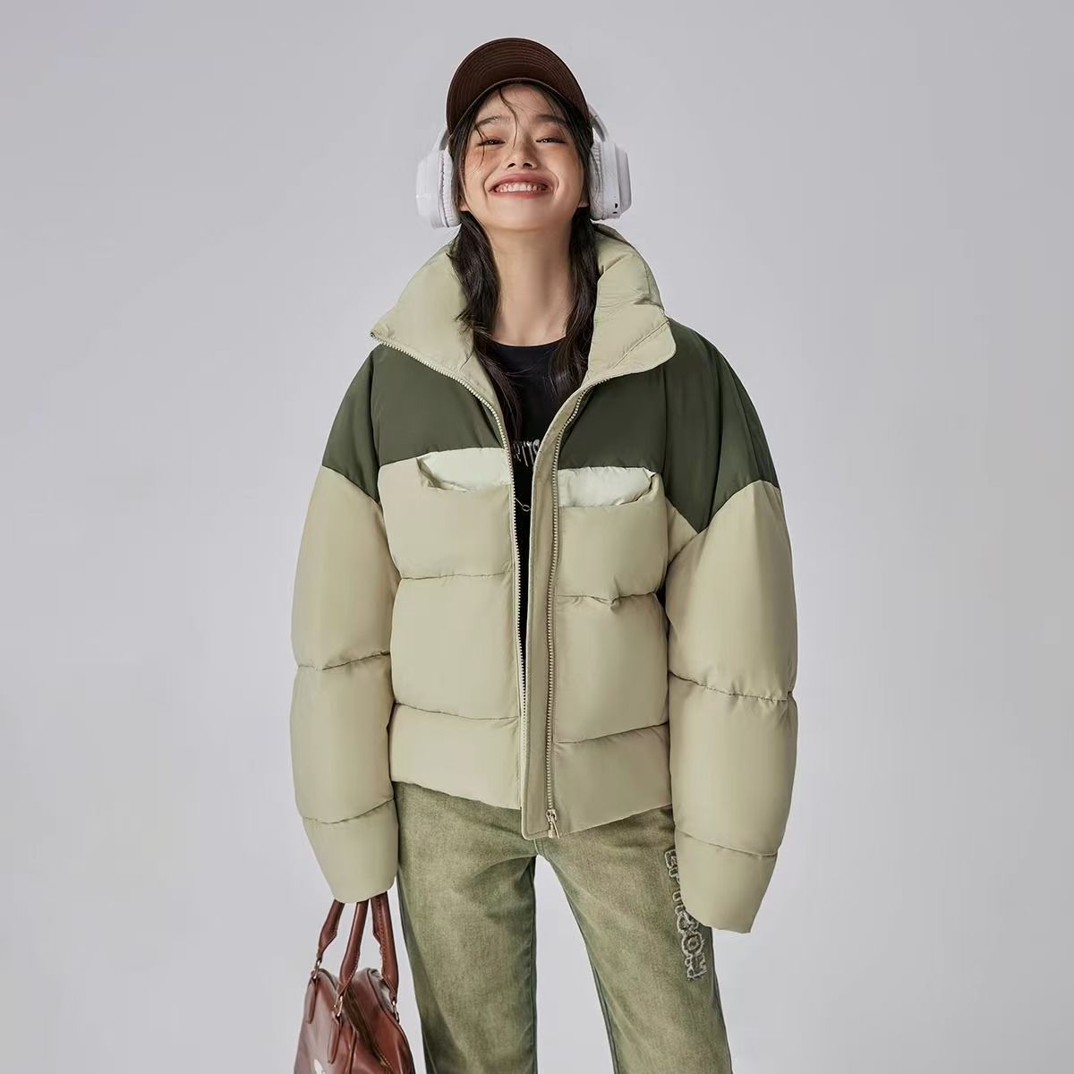 Elegant colorblock stand collar women puffer jackets with thick warm padding and OEM custom options for global brands.