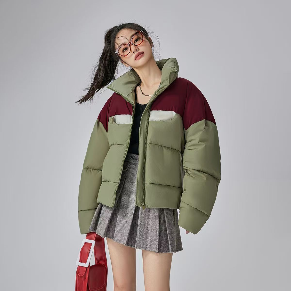 Elegant colorblock stand collar women puffer jackets with thick warm padding and OEM custom options for global brands.